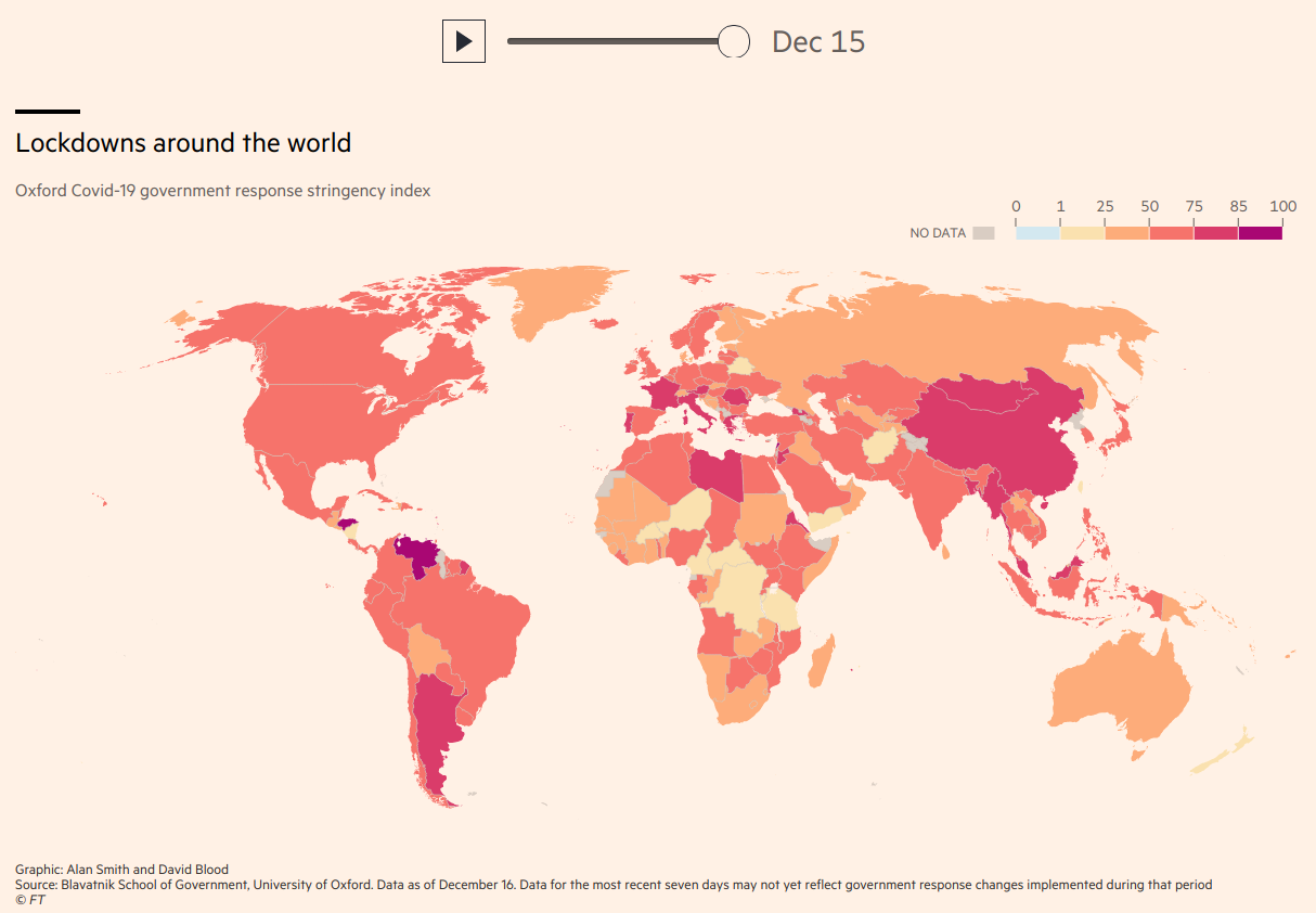 Per confrontare le contromisure adottate dai governi in termini di politiche restrittive si può ricorrere a un indice messo a punto dall'Università di Oxford: qui sotto riproduco la mappa mondiale per la giornata del 15 Dicembre 2020.
