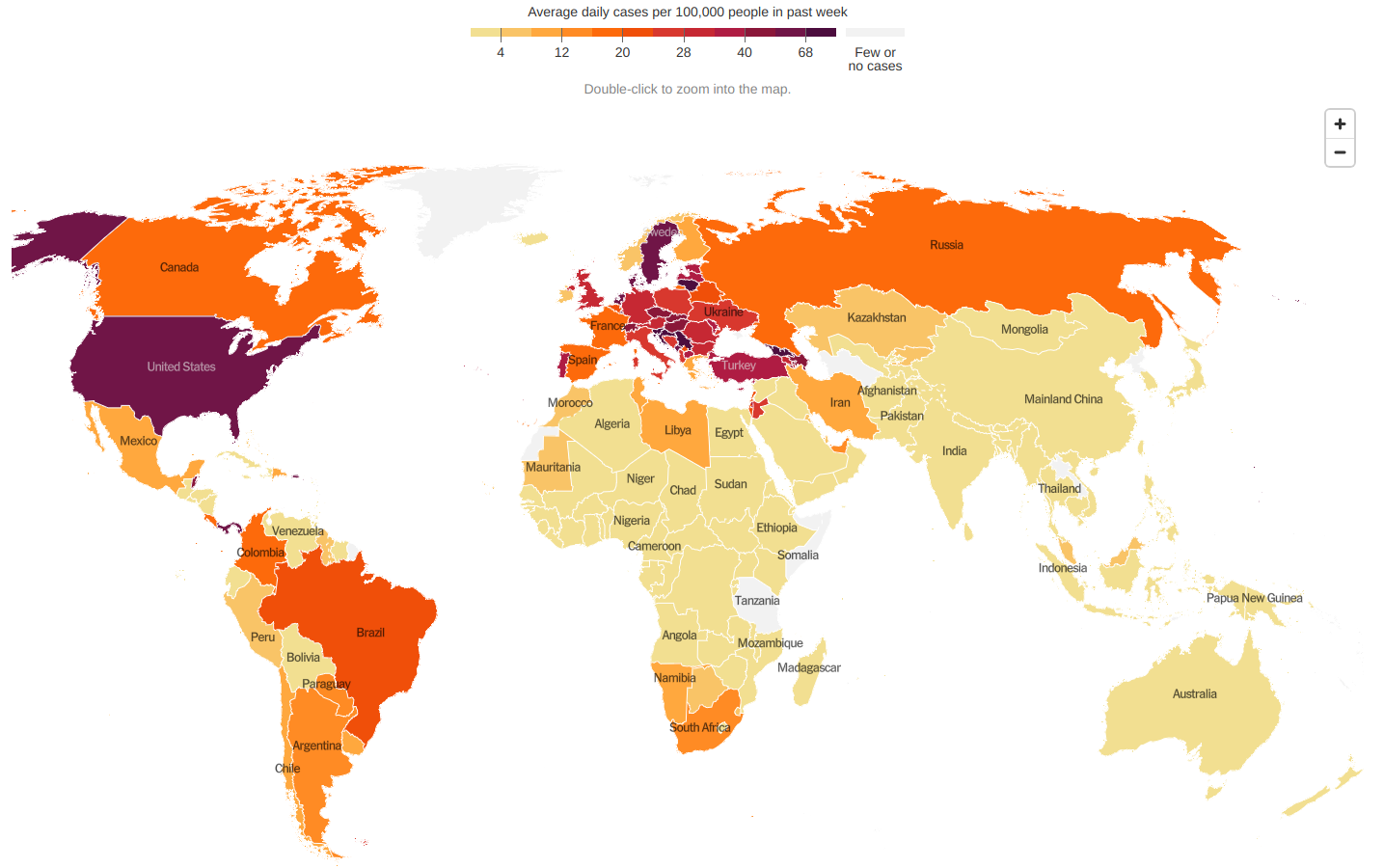 Per una visione rapida di come stanno evolvendo i contagi si può vedere la pagina apposita del sito Our World in Data, che permette di esplorare i dati in modo interattivo.