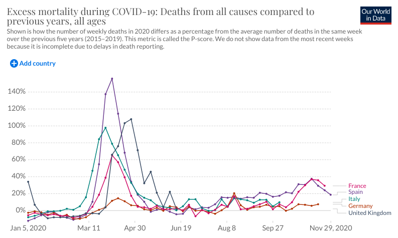 Indice importante dell'impatto della malattia sulla società è la Mortalità Generale, non quella riferita ai soli casi riscontrati della malattia. Infatti il dato generale tiene conto, oltre ai decessi per Covid-19 rilevati, anche di quelli non rilevati, oltre a quelli imputabili indirettamente alla pandemia, per esempio per la saturazione del sistema sanitario.
